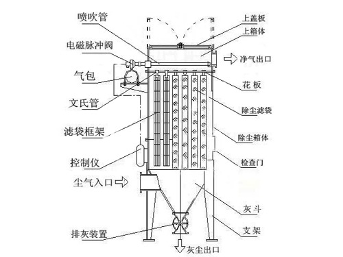 6、除塵器在進(jìn)風(fēng)口的部位設(shè)置一塊擋板,防止了含塵氣體直接沖擊布袋,增加了布袋的使用壽命。